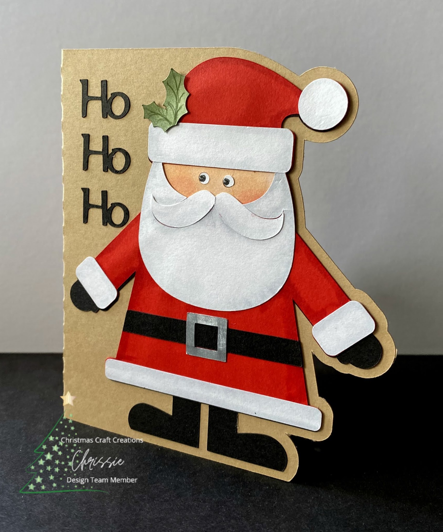 This one is my DT card for the challenge at Christmas Craft Creations, where the theme is to make a shaped card. I saw this little chap in the store on the Silhouette site when I was looking for something else and thought he was kinda cute. Once cut out he looked rather flat and so I added some shading the different parts of him, to give him a little more appeal! There was a gap at the top left of the card base which I thought was the perfect place for a 'Ho Ho Ho' so I made those and cut them with my Portrait. The joy of making sentiments using an electronic cutter, is that you can choose the font you think looks most suitable. I usually try to weld the letters together so that adhering them to the card is a much more simple process!